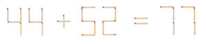 Streichholzrätsel #387 Veröffentlicht am 4. April 2026 von Klaus Antworten Die folgende Gleichung ist natürlich falsch. Lege zwei Streichhölzer so um, dass die Gleichung richtig ist. Soll eine 1 in eine 7 geändert werden, so zählt das Verschieben der betroffenen Streichhölzer aus Platzgründen nach rechts nicht als Umlegen.