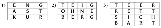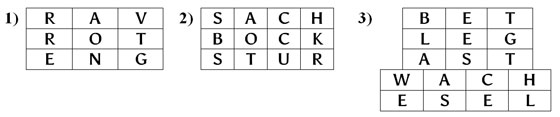 Hilfe, die Buchstaben dieser drei Wörter haben sich komplett neu sortiert. Doch wie waren die ursprünglichen Wörter? (ü = ue, ß = ss usw.)