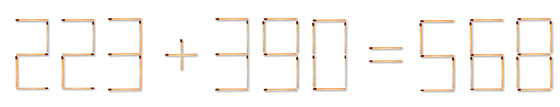 Streichholzrätsel #377 Veröffentlicht am 24. Januar 2026 von Klaus Die folgende Gleichung ist natürlich falsch. Lege zwei Streichhölzer so um, dass die Gleichung richtig ist. Soll eine 1 in eine 7 geändert werden, so zählt das Verschieben der betroffenen Streichhölzer aus Platzgründen nach rechts nicht als Umlegen.