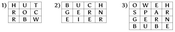 Hilfe, die Buchstaben dieser drei Wörter haben sich komplett neu sortiert. Doch wie waren die ursprünglichen Wörter? (ü = ue, ß = ss usw.)