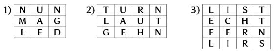 Wortpuzzle #196 – Freizeit/Kultur Veröffentlicht am 24. November 2014 von Klaus Hilfe, die Buchstaben dieser drei Wörter haben sich komplett neu sortiert. Doch wie waren die ursprünglichen Wörter? (ü = ue, ß = ss usw.)